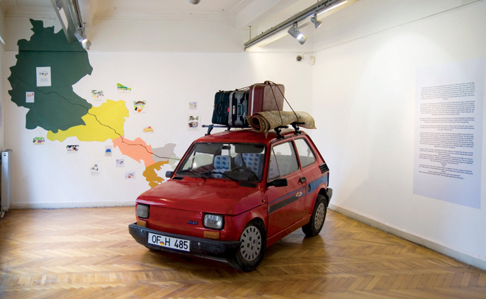 The subject of Gastarbeiter creates the crux of Behind the Wheels by Anny and Sibel Öztürk. In the installation Behind the Wheel (2003), the sisters depict the annual trips back to Turkey. The older model Mercedes Benz (or like in Istanbul and in Montenegro another car model) with Offenbach license plate is in the exhibition space, with its rooftop luggage carrier packed with suitcases and a rolled up carpet. The vehicle’s interior is decorated with streamers, doilies, blankets and pillows. One can hear music alongside voices and laughter that remind us of the absent travelers. With maps illustrating the route, drawings (gouaches of moments in the journey), texts on the walls (speaking of longing for the grandfather, the south, the sea), this story tells of the communal experience among the Gastarbeiter, in Germany presenting us a (re)creation of an annual journey between these two countries. Through this work, the Öztürk sisters turn their family trips into a collectively shared experience and memory, and their experience and memory into an art installation.